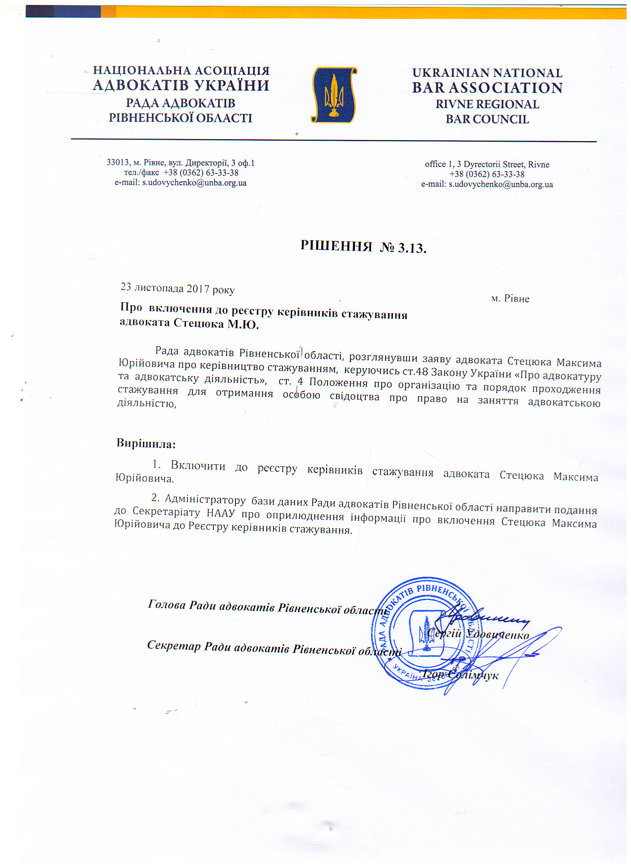 /rishennia/rishennia-rady/576-rishennia-313-pro-vkliuchennia-do-reiestru-kerivnykiv-stazhuvannia-advokata-stetsiuka-myu