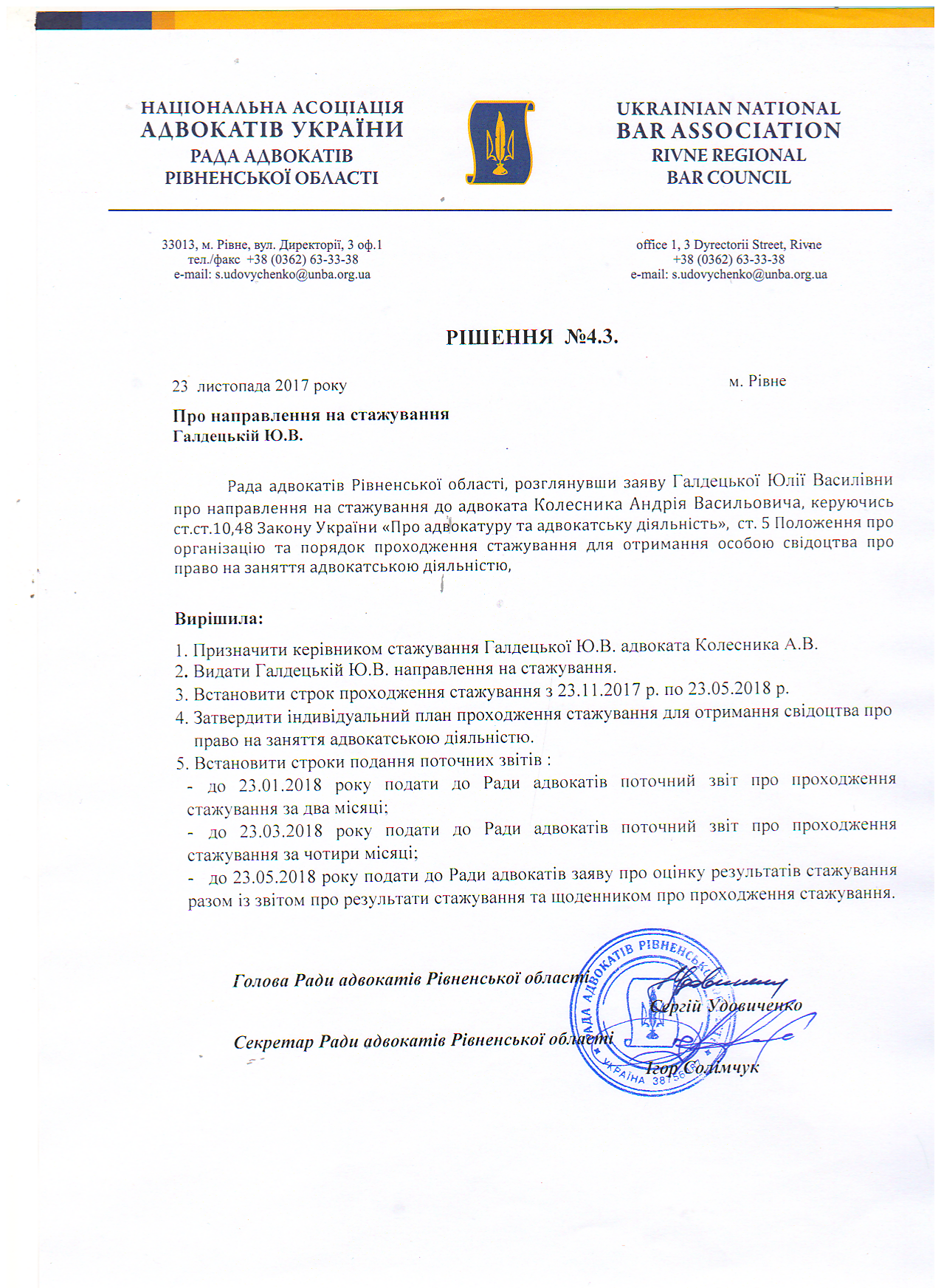 Рішення 4.3: Про направлення на стажування Галдецькій Ю.В.