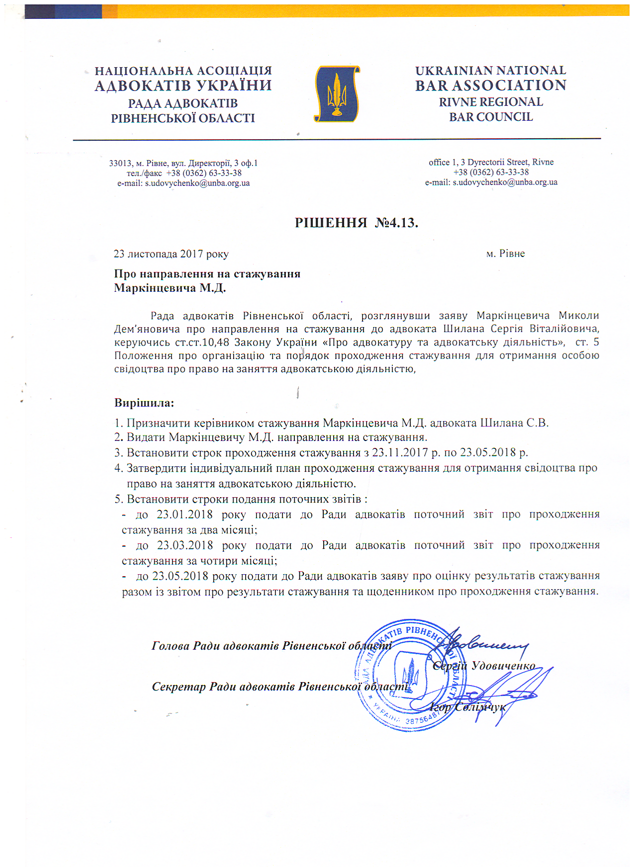 Рішення 4.13: Про направлення на стажування Маркінцевича М.Д.