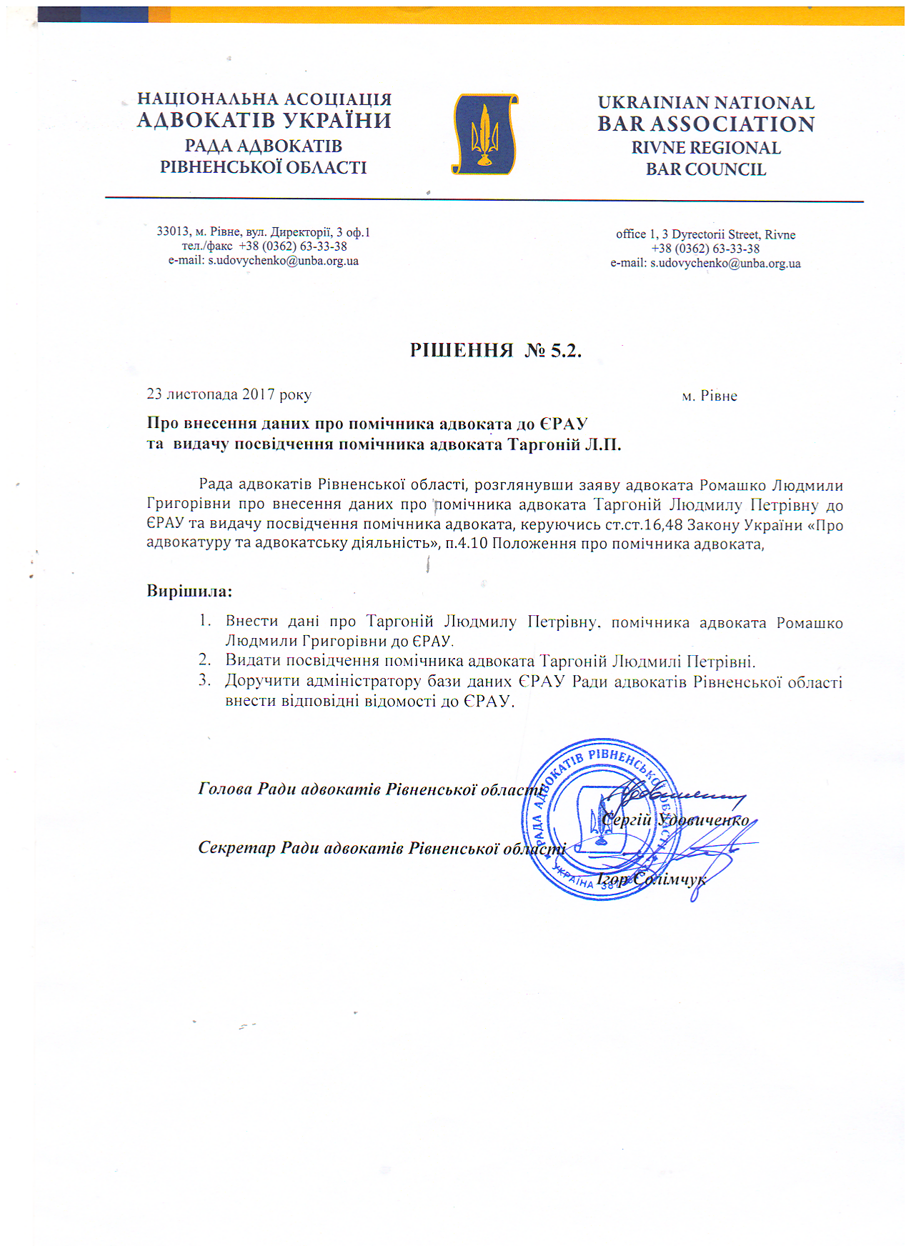 /rishennia/rishennia-rady/593-rishennia-52-pro-vnesennia-danykh-pro-pomichnyka-advokata-do-yerau-ta-vydachu-posvidchennia-pomichnyka-advokata-tarhonii-lp