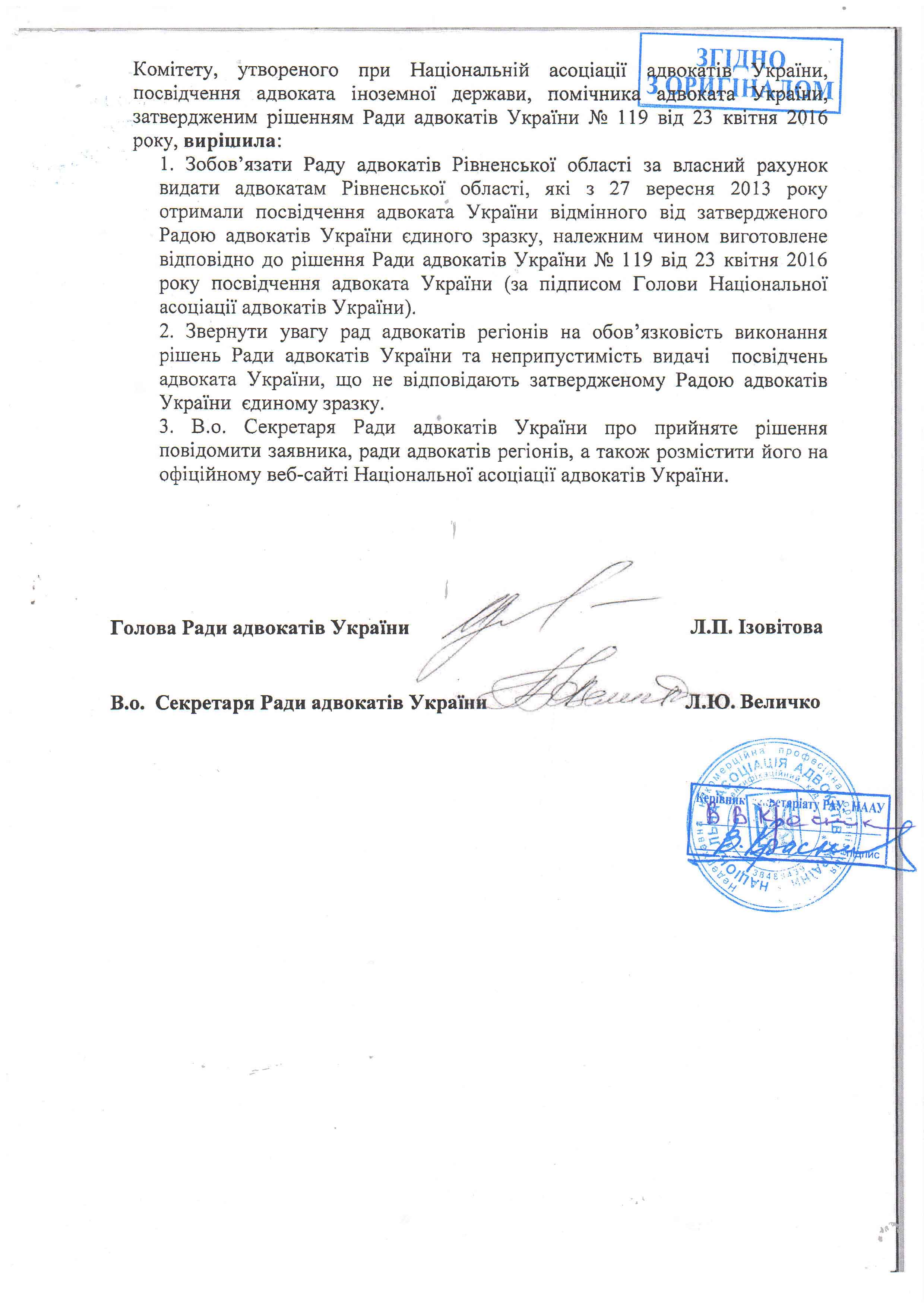 Рада адвокатів України надала роз'яснення щодо необхідності виготовлення Радою адвокатів Рівненської області посвідчення адвоката України за її рахунок адвокатам, яким було виготовлено посвідчення зразка, відмінного від затвердженого Радою адвокатів України єдиного зразка.