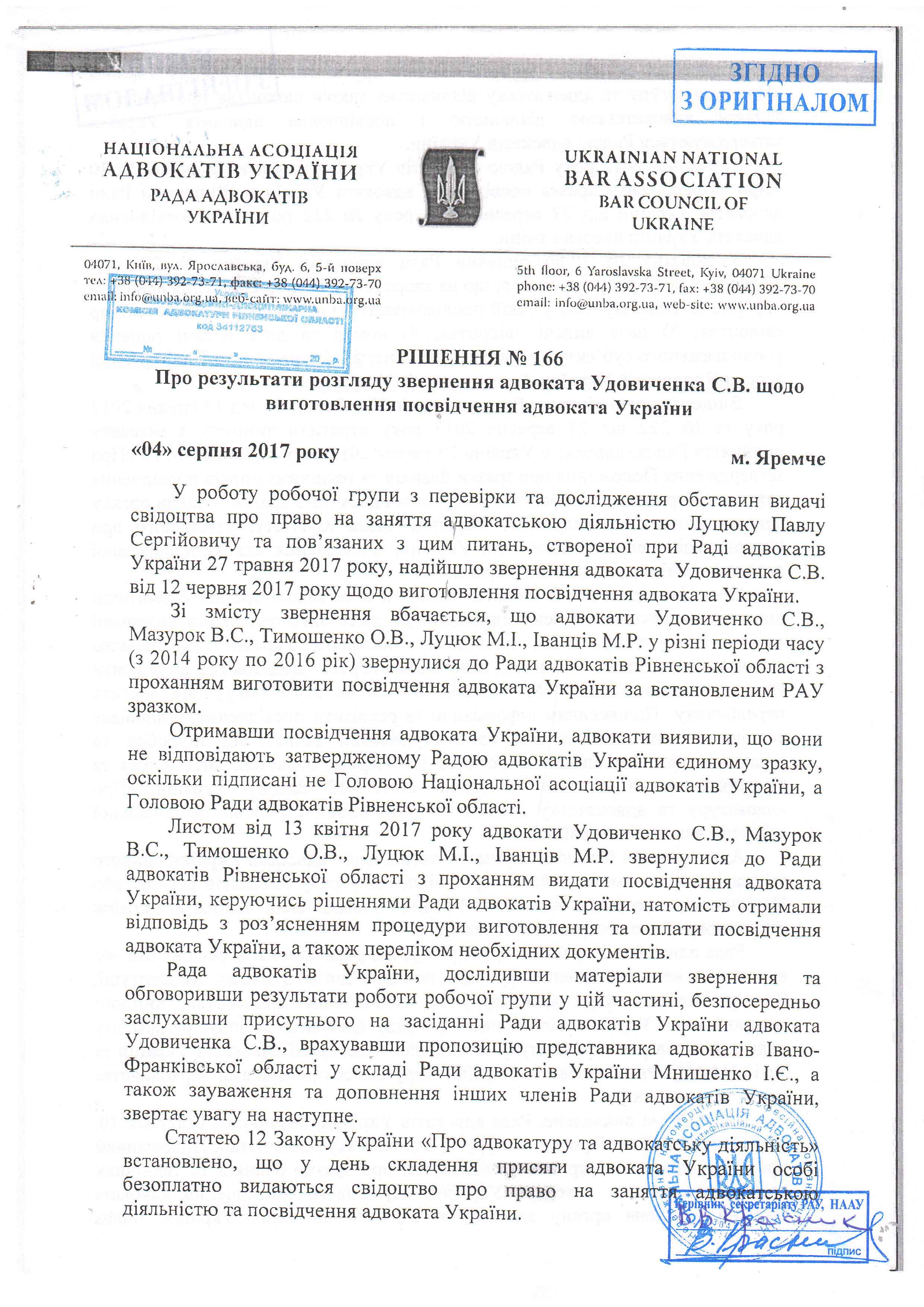 Рішення №166 Про результати розгляду звернення адвоката Удовиченка С.В. щодо виготовлення посвідчення адвоката України
