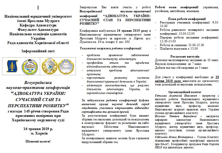 Шановні колеги, повідомляємо вас, що 16 травня 2019 року з 10:00 до 15.00 Національною асоціацією адвокатів України спільно з Національним юридичним університетом імені Ярослава Мудрого, Радою адвокатів Харківської області, Кафедрою Адвокатури та Факультетом Адвокатури проводиться Всеукраїнська науково-практична конференція з нагоди 145-річчя створення Ради присяжних повірених при Харківському окружному суді за темою “АДВОКАТУРА УКРАЇНИ: СУЧАСНИЙ СТАН ТА ПЕРСПЕКТИВИ РОЗВИТКУ”.