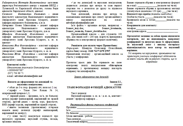 Для участі у конференції запрошуються адвокати, науковці та особи, що цікавляться розвитком адвокатури з усіх регіонів України.