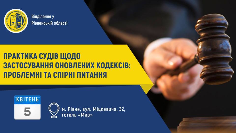 Відділення Асоціації правників України в Рівненській області запрошує Вас взяти участь у зустрічі з суддею Верховного Суду на тему «Практика судів щодо застосування оновлених кодексів: проблемні та спірні питання».