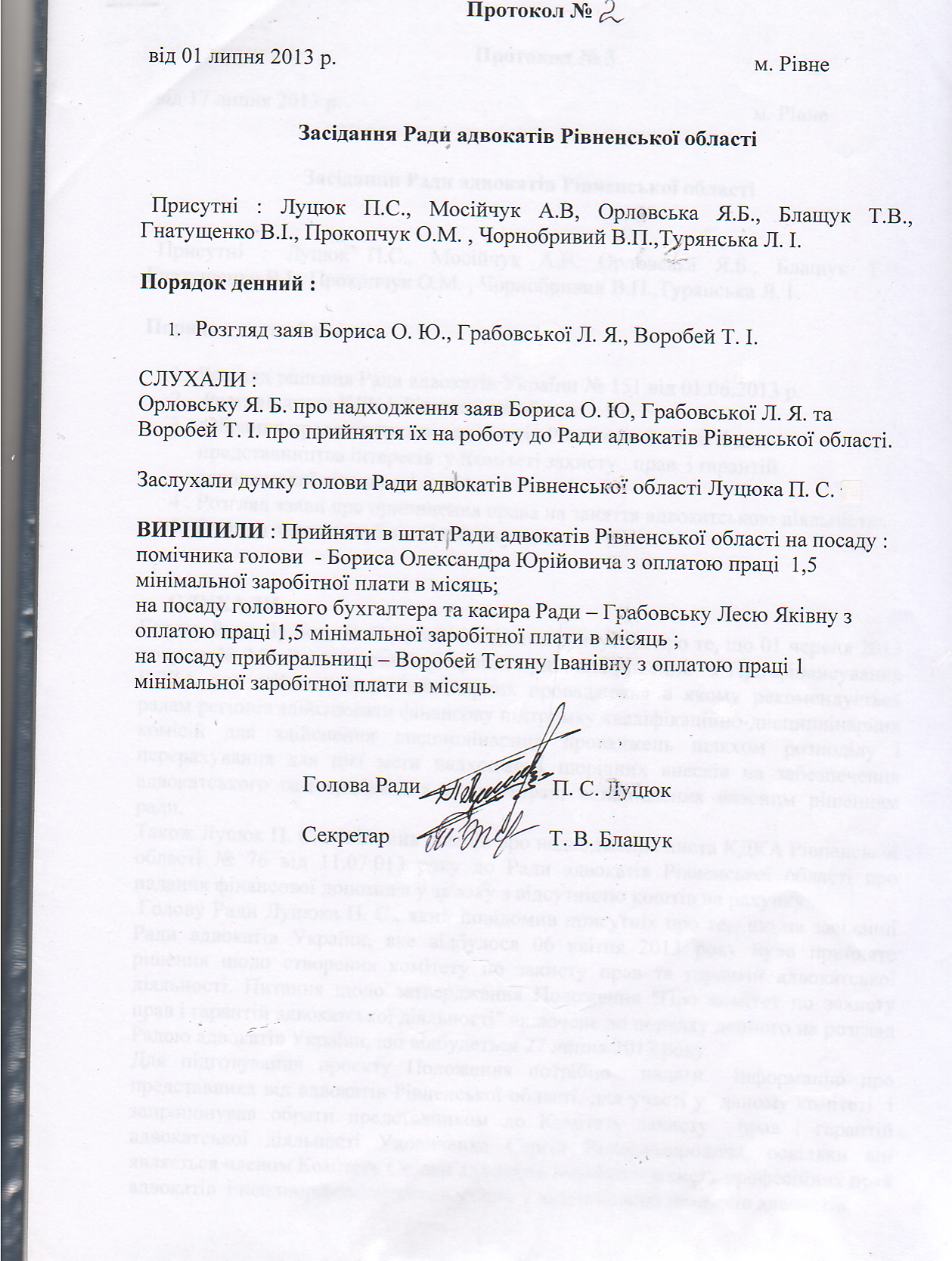Протокол №2 засідання Ради адвокатів Рівненської області від 01072013