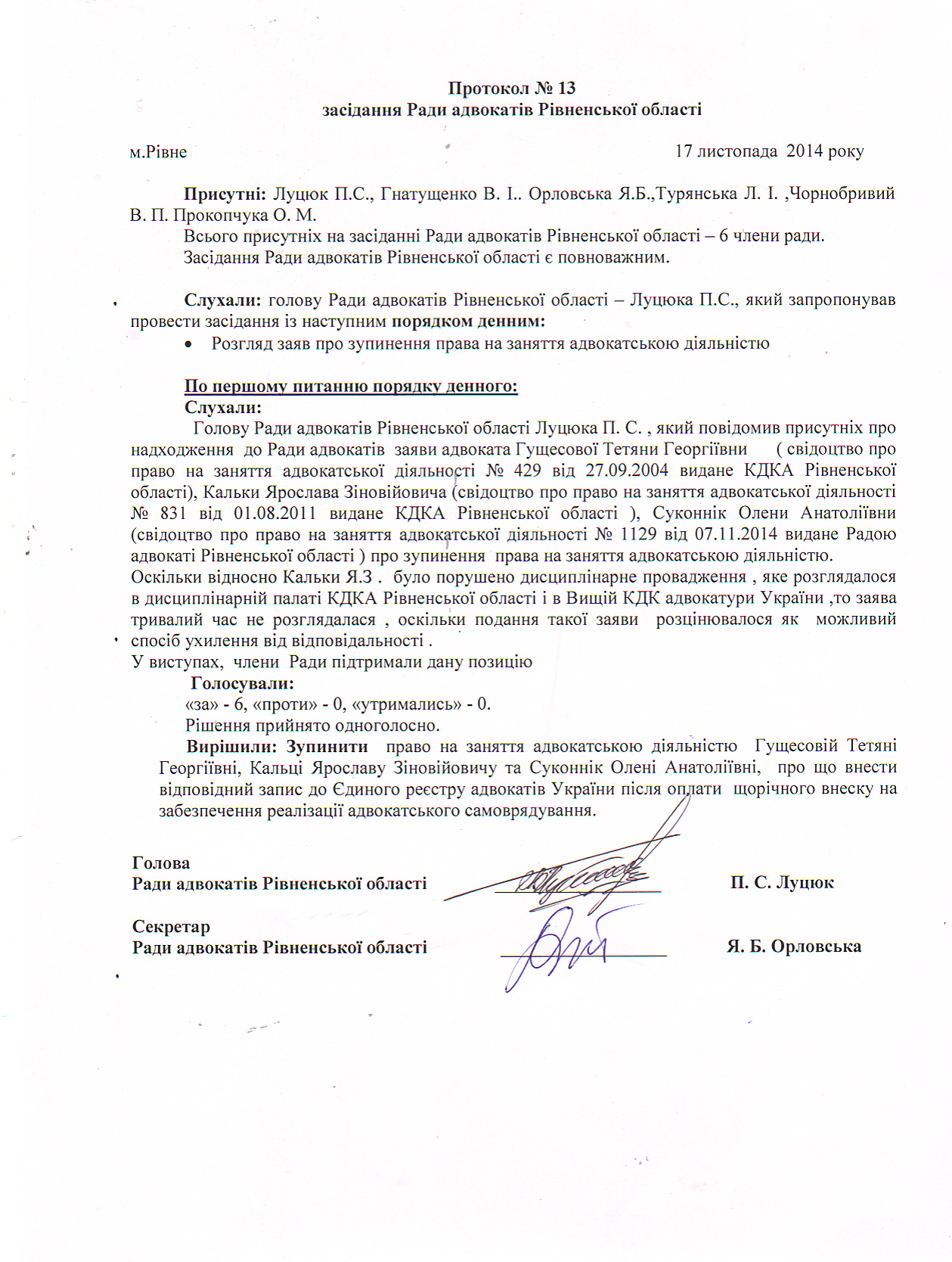 Протокол №13 засідання Ради адвокатів Рівненської області від 17112014