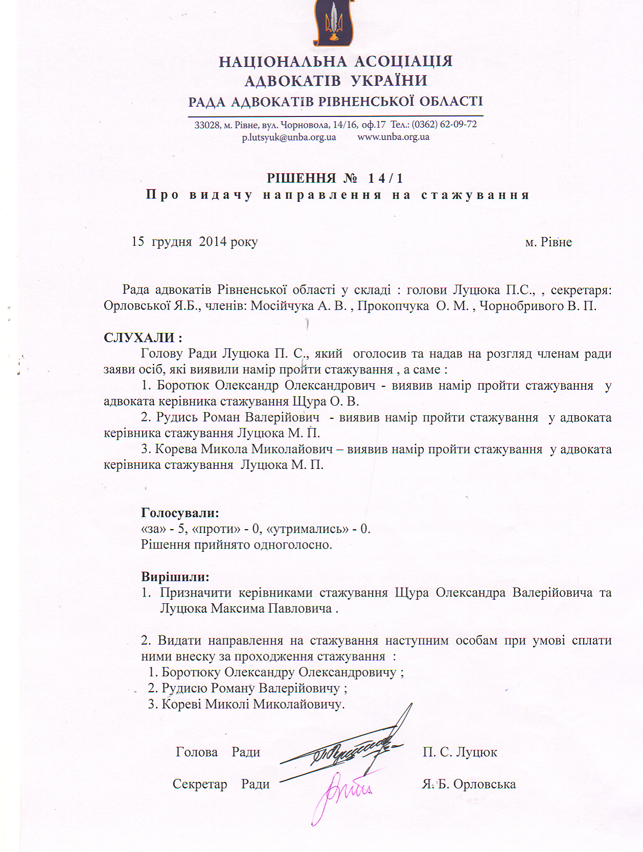 Рішення 14/1: Про видачу направлення на стажування
