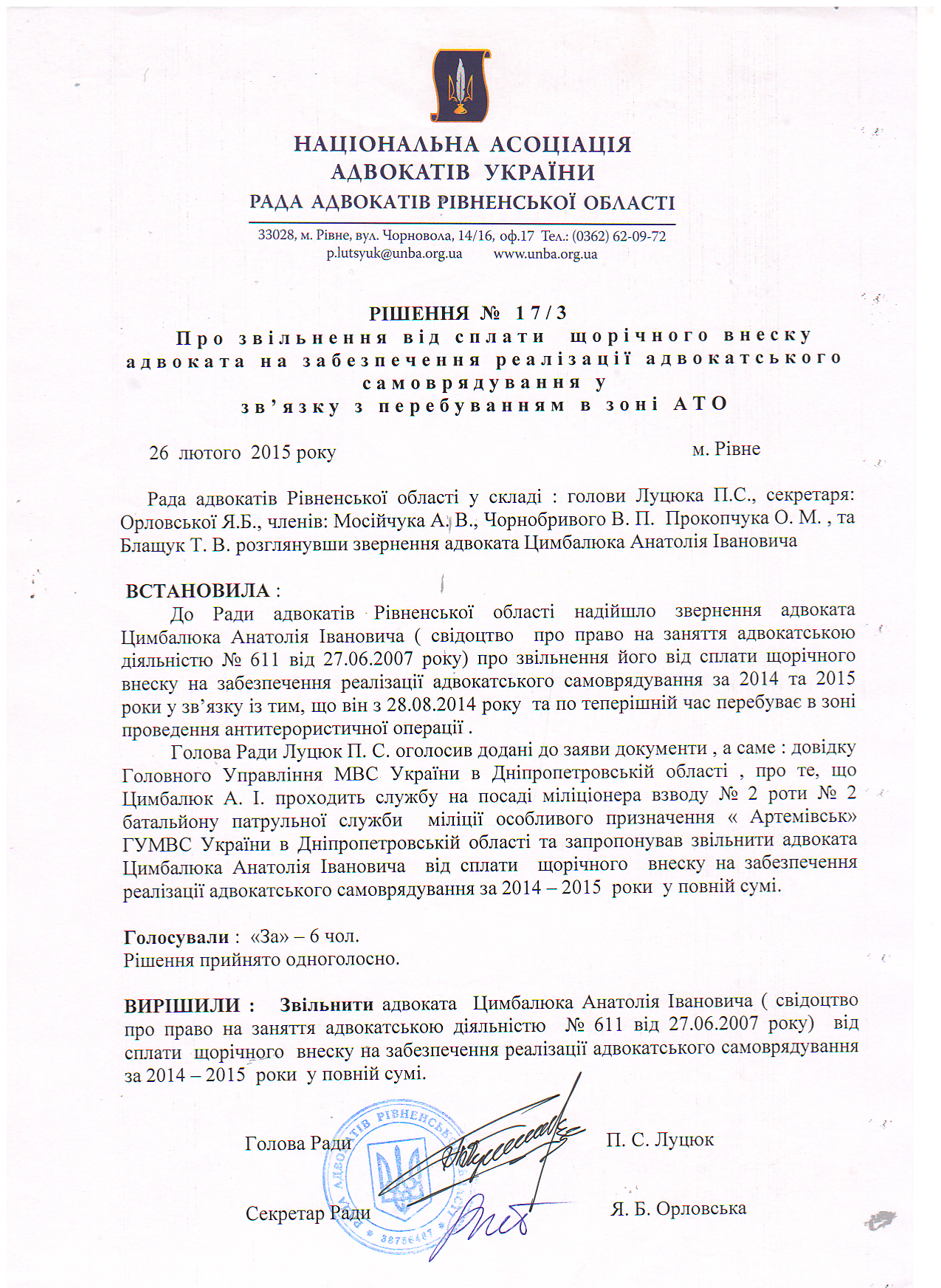 /rishennia/rishennia-rady/187-rishennia-17-3-pro-zvilnennia-vid-splaty-shchorichnoho-vnesku-advokata-na-zabezpechennia-realizatsii-advokatskoho-samovriaduvannia-u-zviazku-z-perebuvanniam-v-zoni-ato
