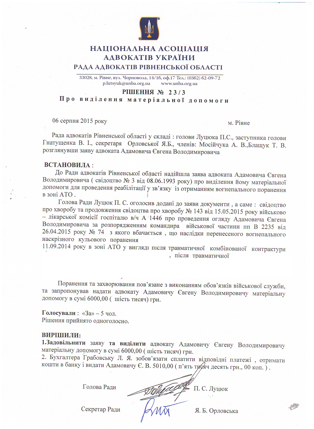 У зв'язку з тим, що діагноз, поставлений особі лікарем є конфіденційною інформацією, то із оприлюдненої мотивувальної частини рішення Ради адвокатів Рівненської області №23/3 Про виділення матеріальної допомоги таку інформацію виключено на виконання положень ч. 3 ст. 286 Цивільного кодексу України.