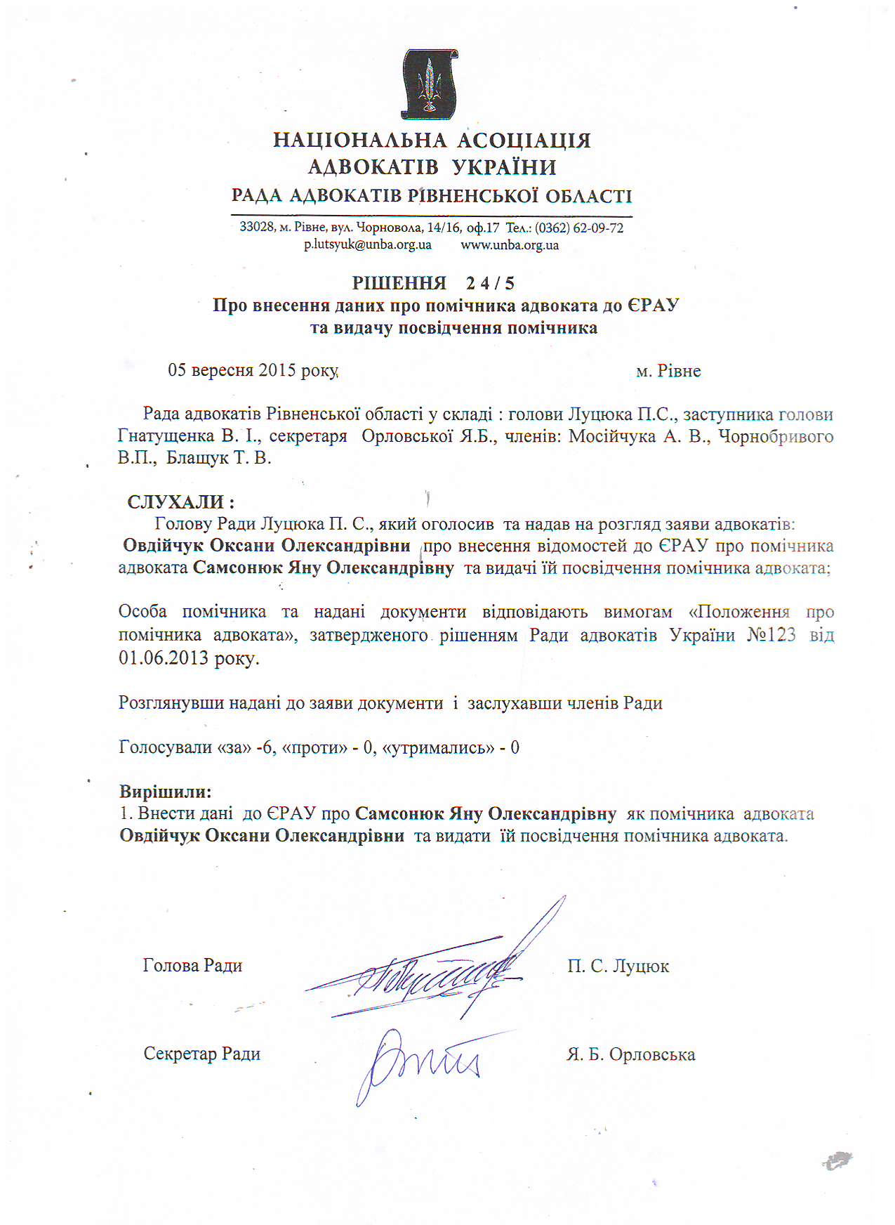 /rishennia/rishennia-rady/236-rishennia-24-5-pro-vnesennia-danykh-pro-pomichnyka-advokata-do-yerau-ta-vydachu-posvidchennia-pomichnyka