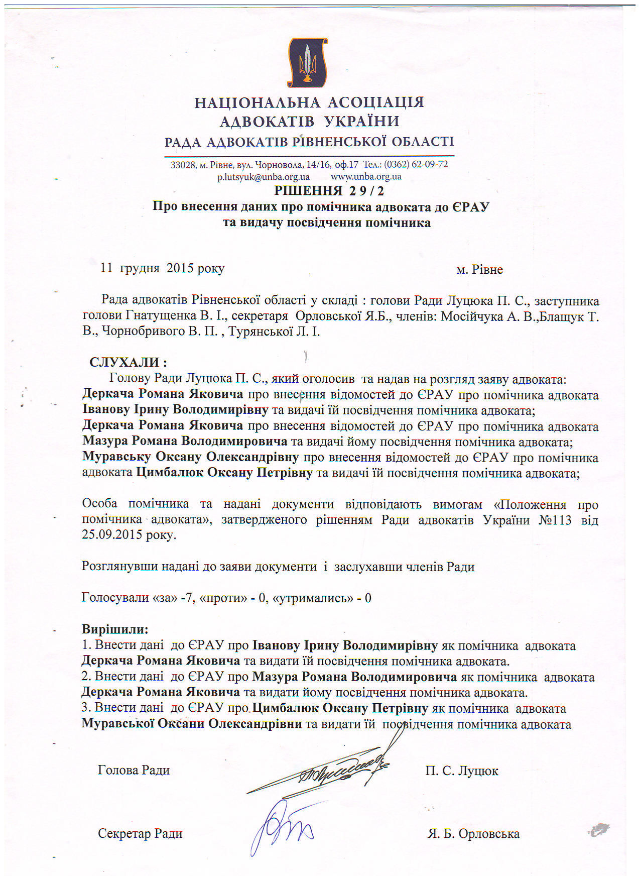 /rishennia/rishennia-rady/256-rishennia-29-2-pro-vnesennia-danykh-pro-pomichnyka-advokata-do-yerau-ta-vydachu-posvidchennia-pomichnyka