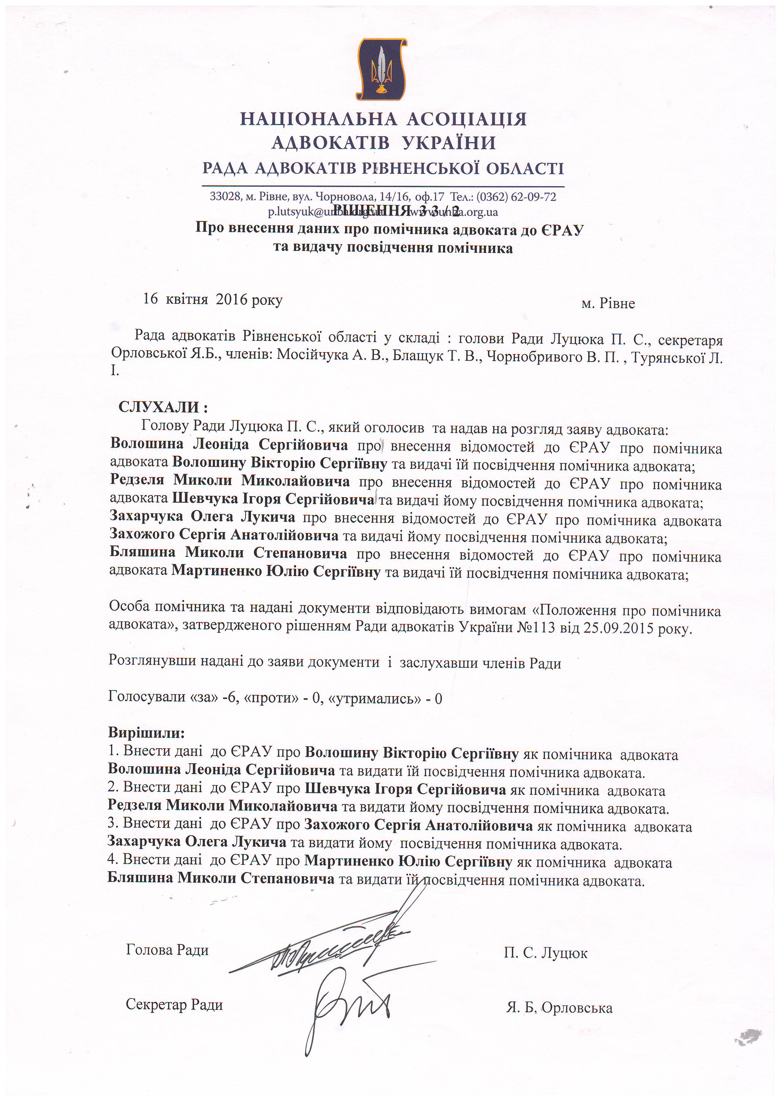/rishennia/rishennia-rady/297-rishennia-33-2-pro-vnesennia-danykh-pro-pomichnyka-advokata-do-yerau-ta-vydachu-posvidchennia-pomichnyka