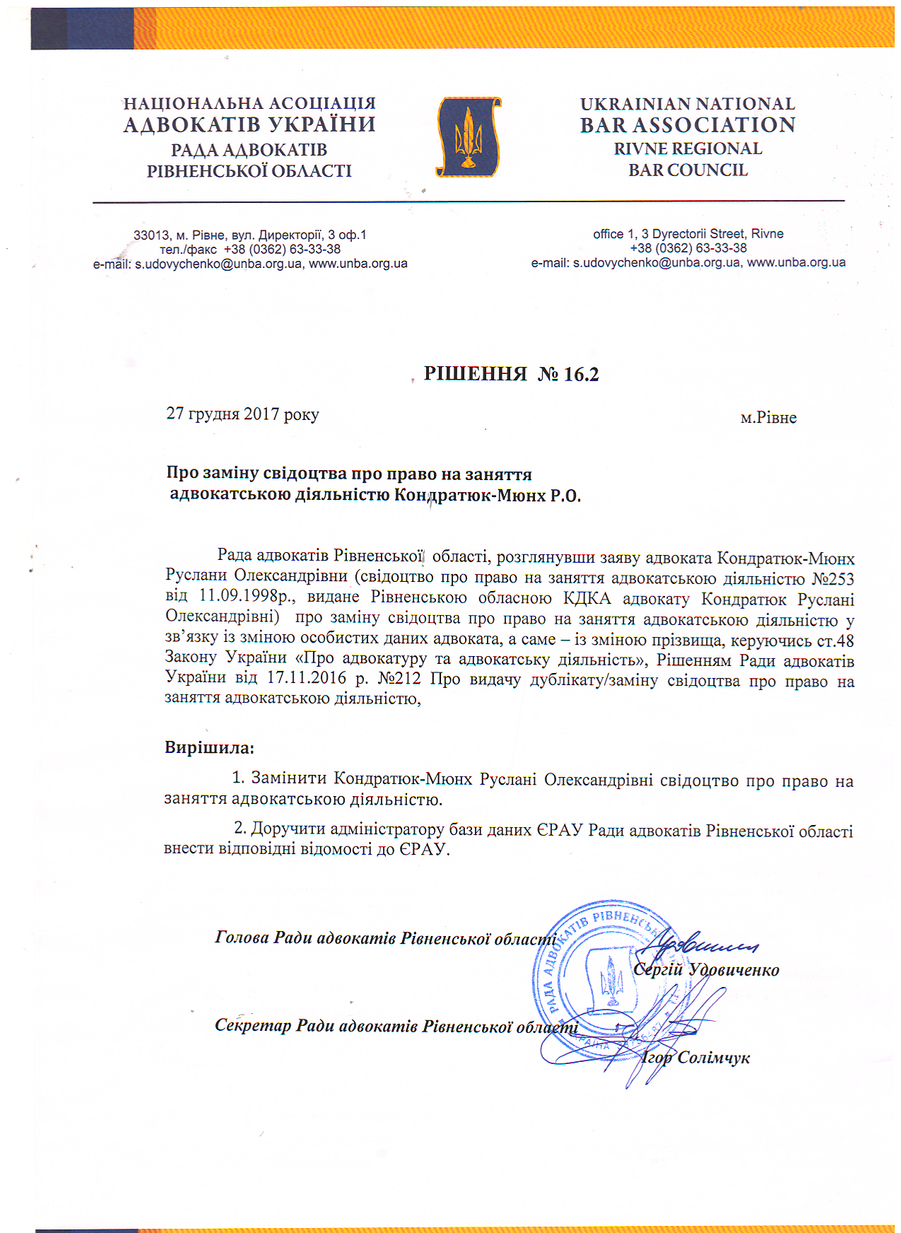 /rishennia/rishennia-rady/660-rishennia-162-pro-zaminu-svidotstva-pro-pravo-na-zaniattia-advokatskoiu-diialnistiu-kondratiuk-miunkh-ro