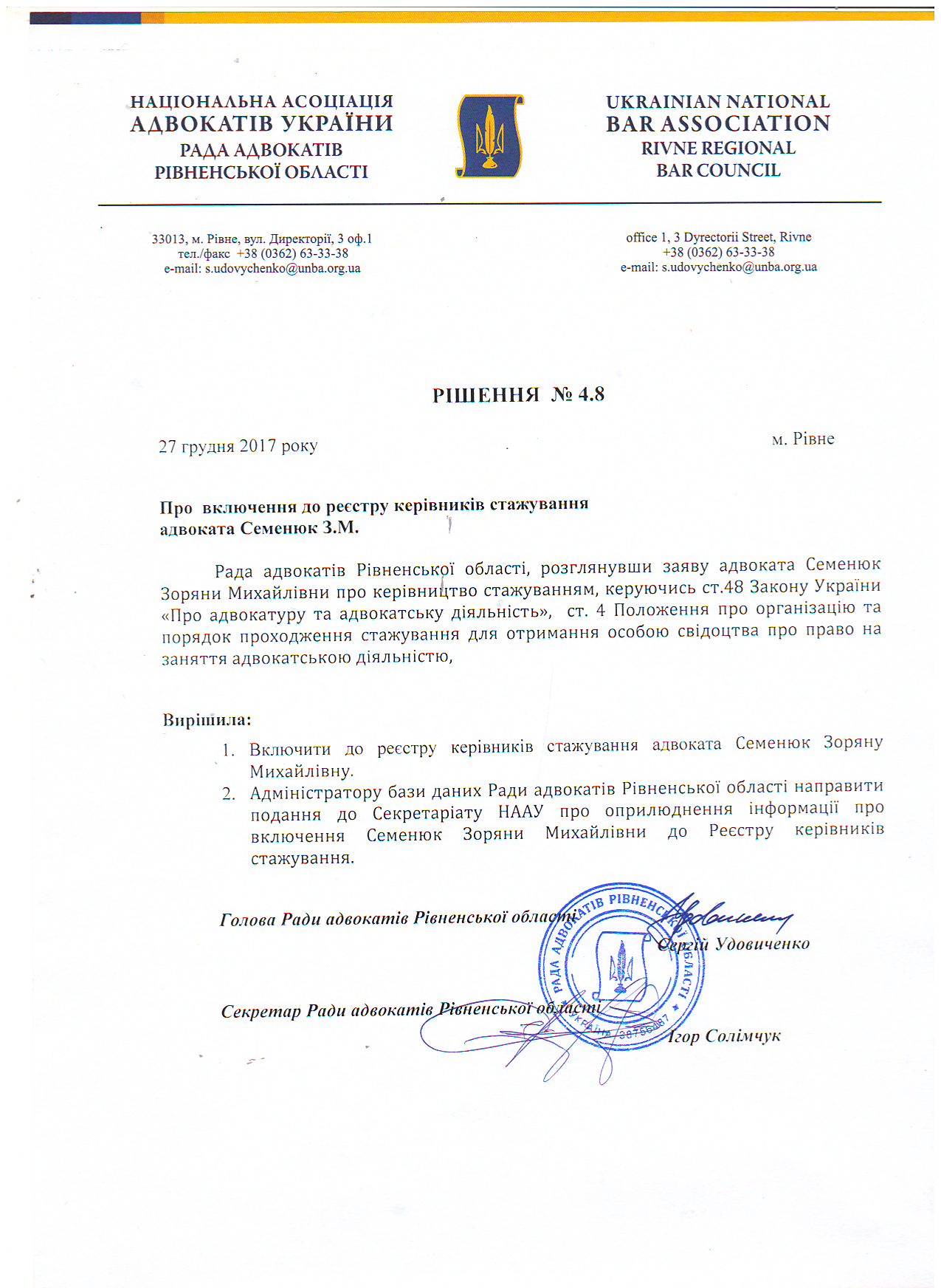 /rishennia/rishennia-rady/675-rishennia-4-8-pro-vkliuchennia-do-reiestru-kerivnykiv-stazhuvannia-advokata-semeniuk-zm