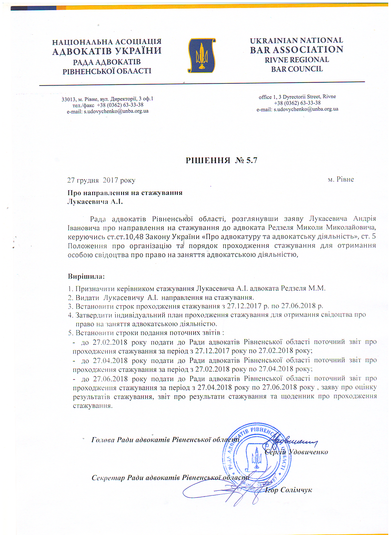 Рішення 5/7: Про направлення на стажування Лукасевича А.І.