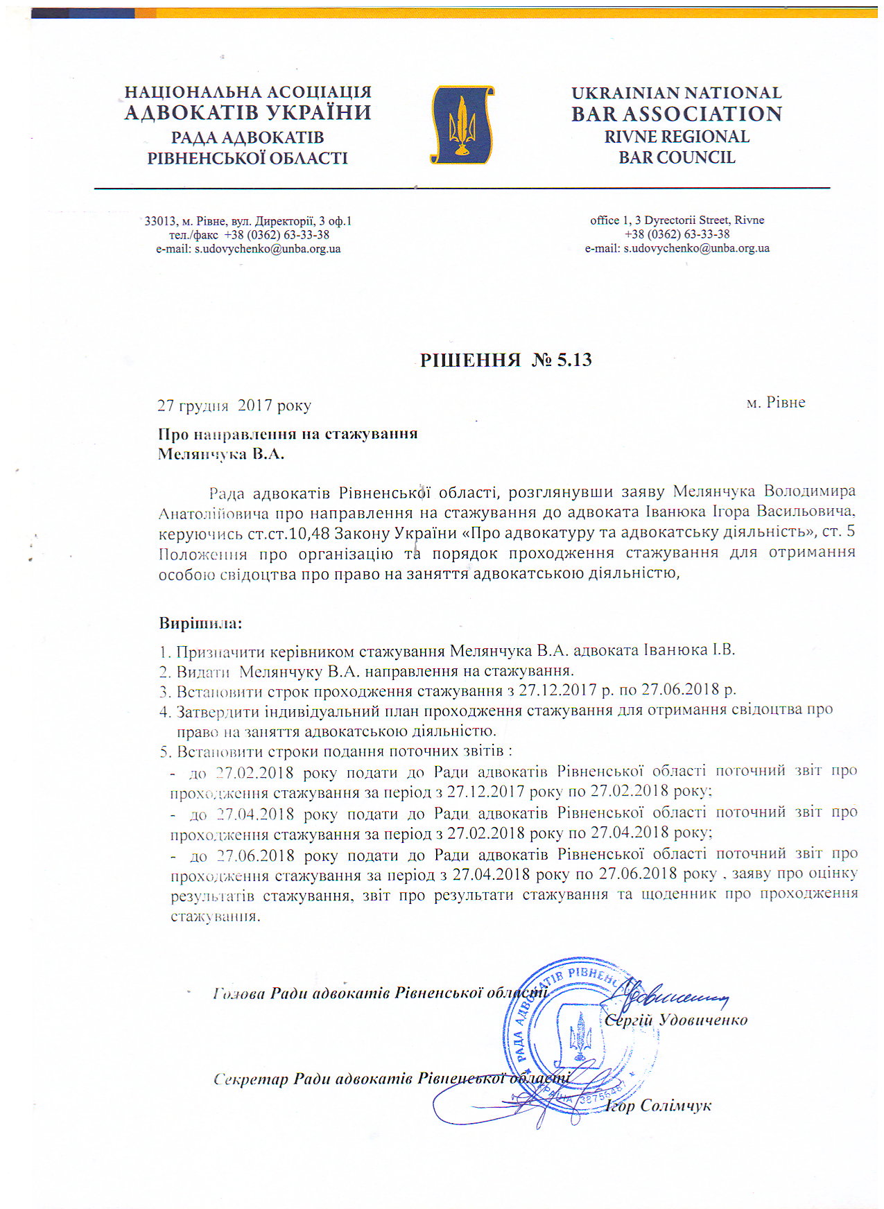 Рішення 5/13: Про направлення на стажування Мелянчука В.А.
