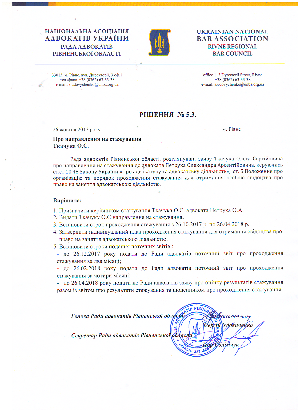 Рішення 5/3: Про направлення на стажування Ткачука О.С.