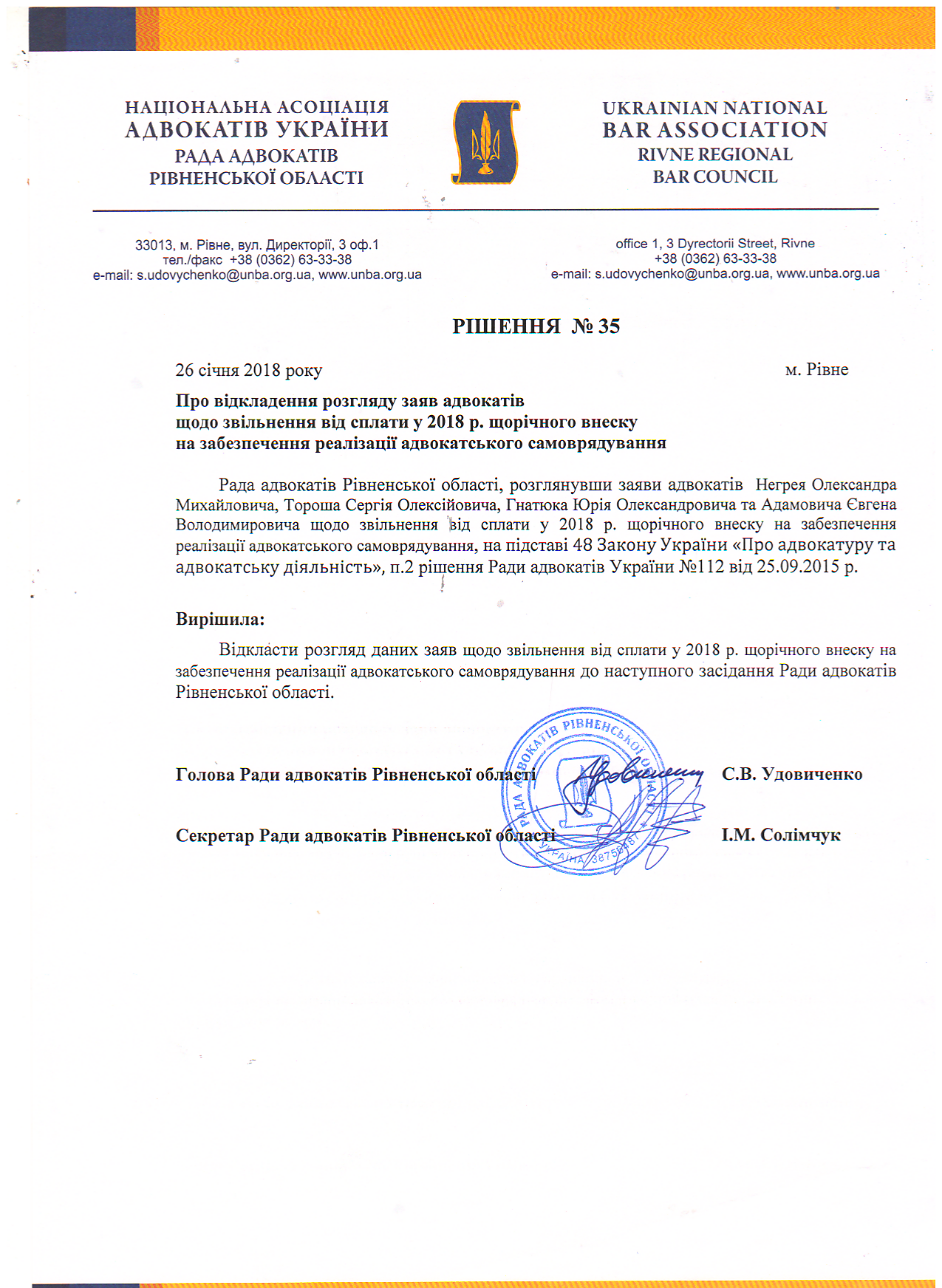 /rishennia/rishennia-rady/769-rishennia-35-pro-vidkladennia-rozhliadu-zaiav-advokativ-shchodo-zvilnennia-vid-splaty-u-2018-r-shchorichnoho-vnesku-na-zabezpechennia-realizatsii-advokatskoho-samovriaduvannia-vid-26012018-r