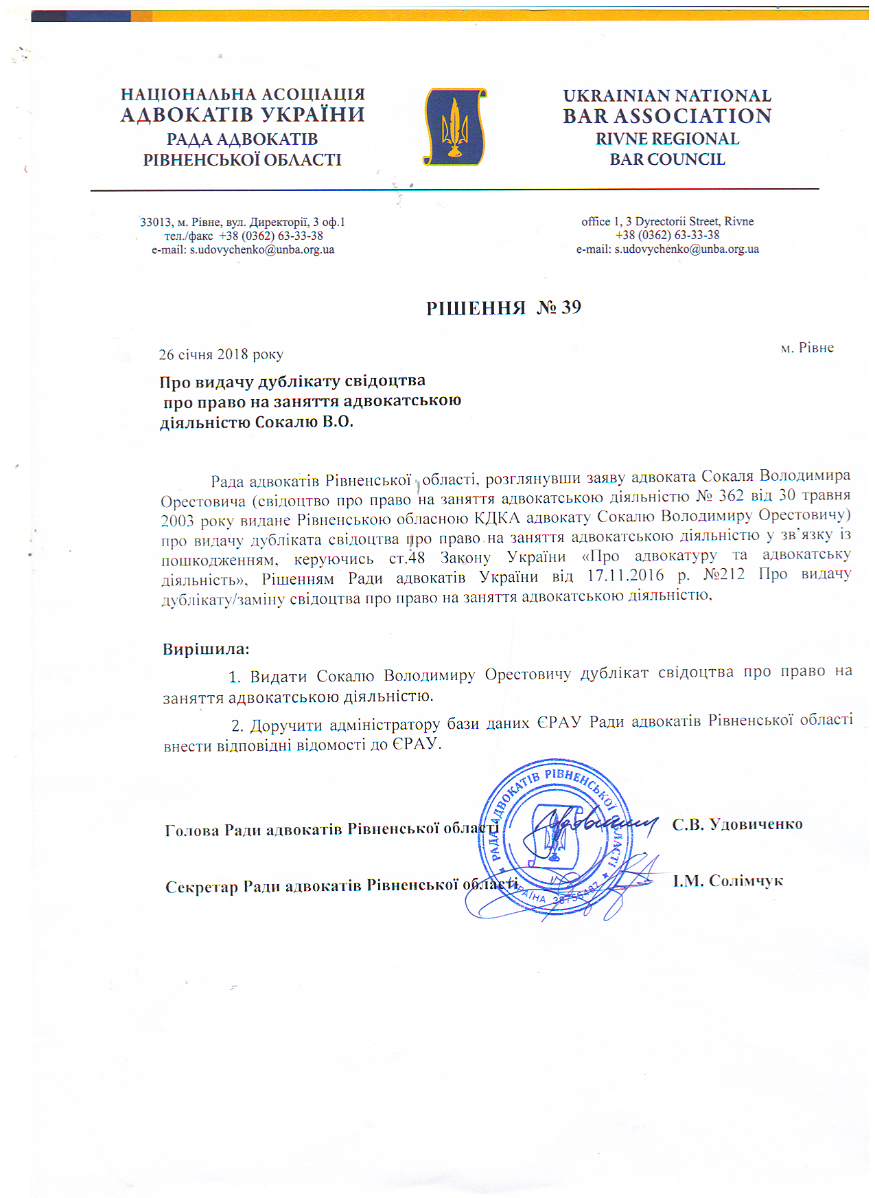 /rishennia/rishennia-rady/773-rishennia-39-pro-vydachu-dublikata-svidotstva-pro-pravo-na-zaniattia-advokatskoiu-diialnistiu-sokaliu-vo-vid-26012018-r