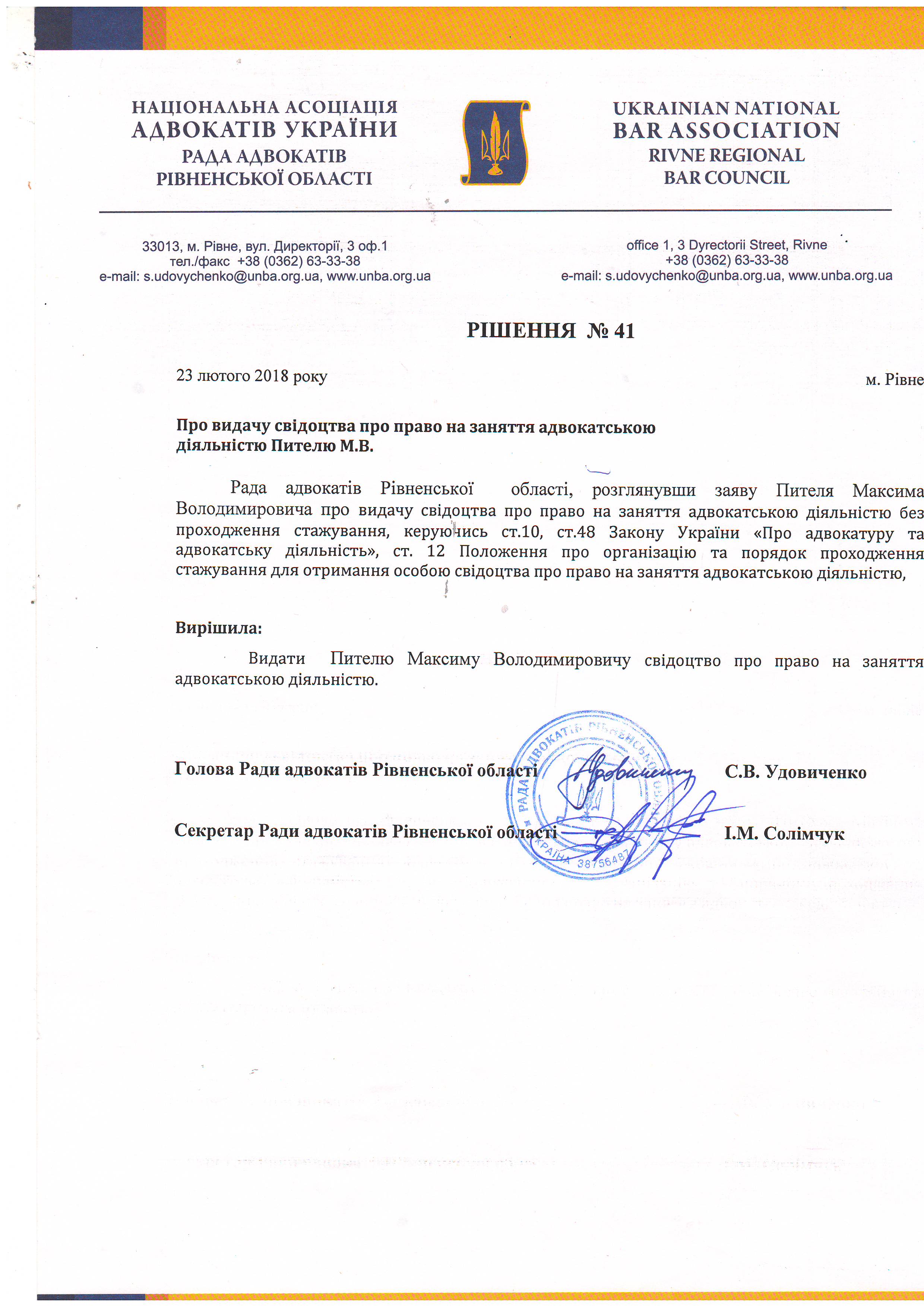 /rishennia/rishennia-rady/775-rishennia-41-pro-vydachu-svidotstva-pro-pravo-na-zaniattia-advokatskoiu-diialnistiu-pyteliu-mv-vid-23022018-r