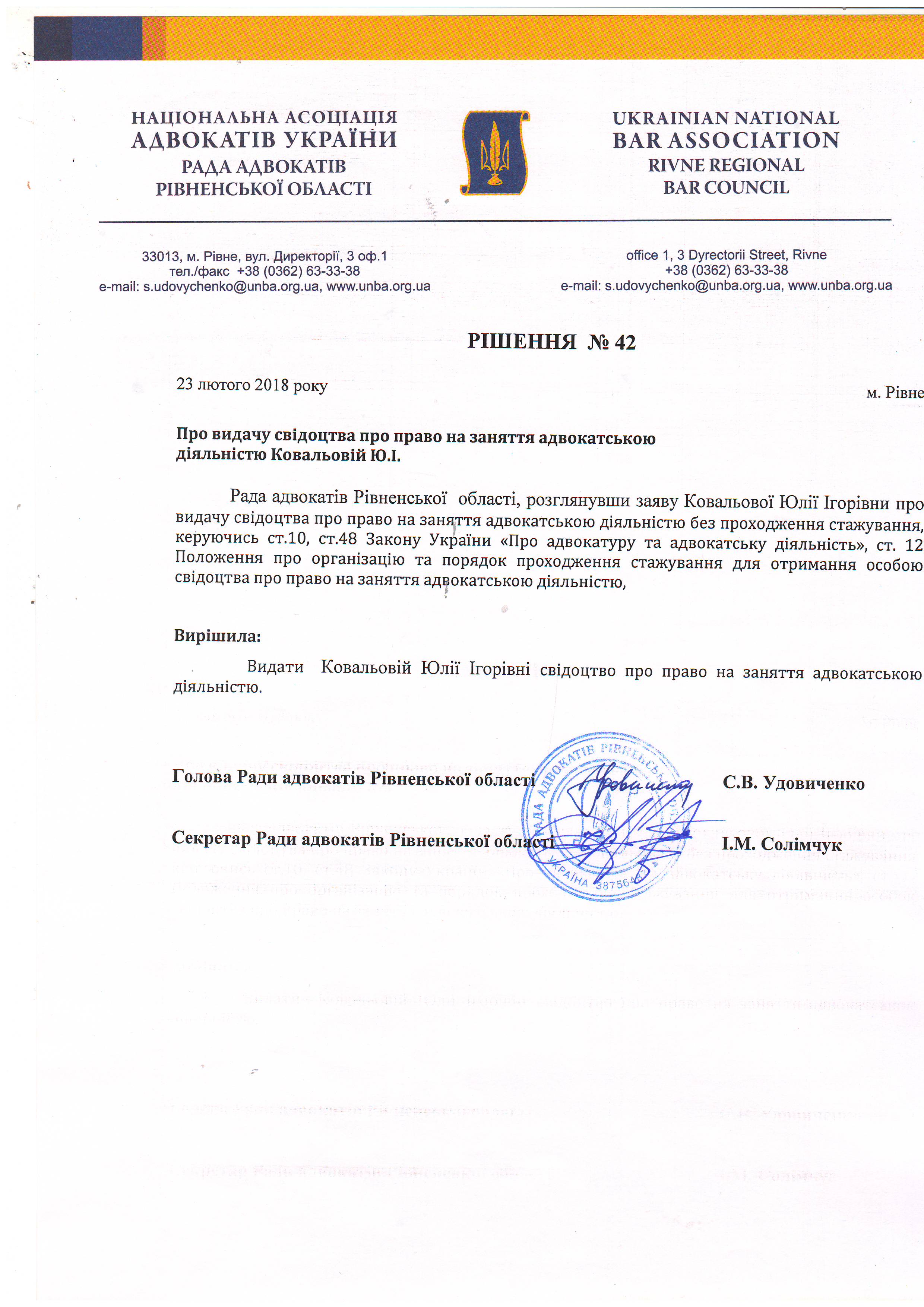 /rishennia/rishennia-rady/776-rishennia-42-pro-vydachu-svidotstva-pro-pravo-na-zaniattia-advokatskoiu-diialnistiu-kovalovii-yui-vid-23022018-r