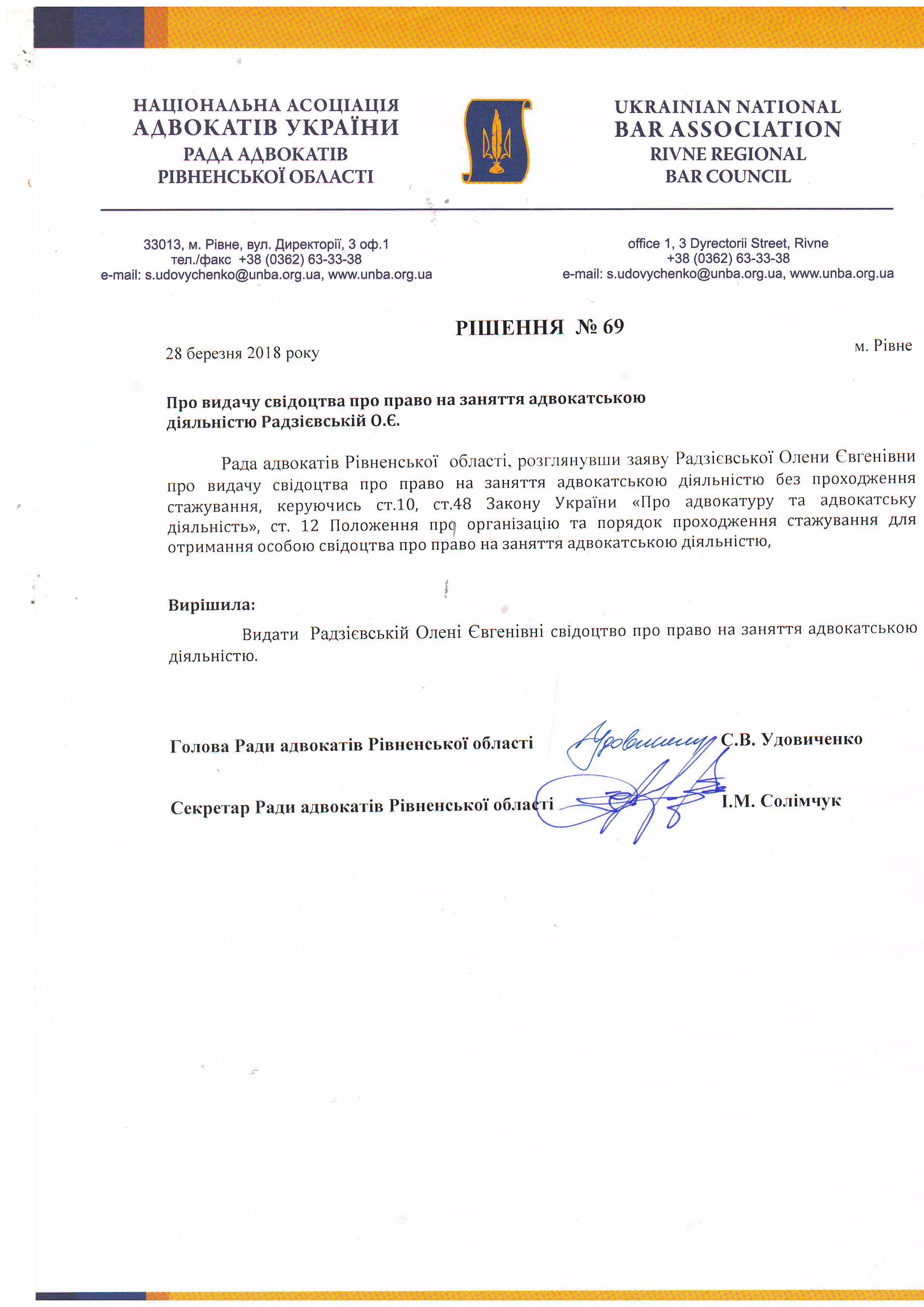 /rishennia/rishennia-rady/803-rishennia-69-pro-vydachu-svidotstva-pro-pravo-na-zaniattia-advokatskoiu-diialnistiu-radziievskii-oye-vid-28032018-r