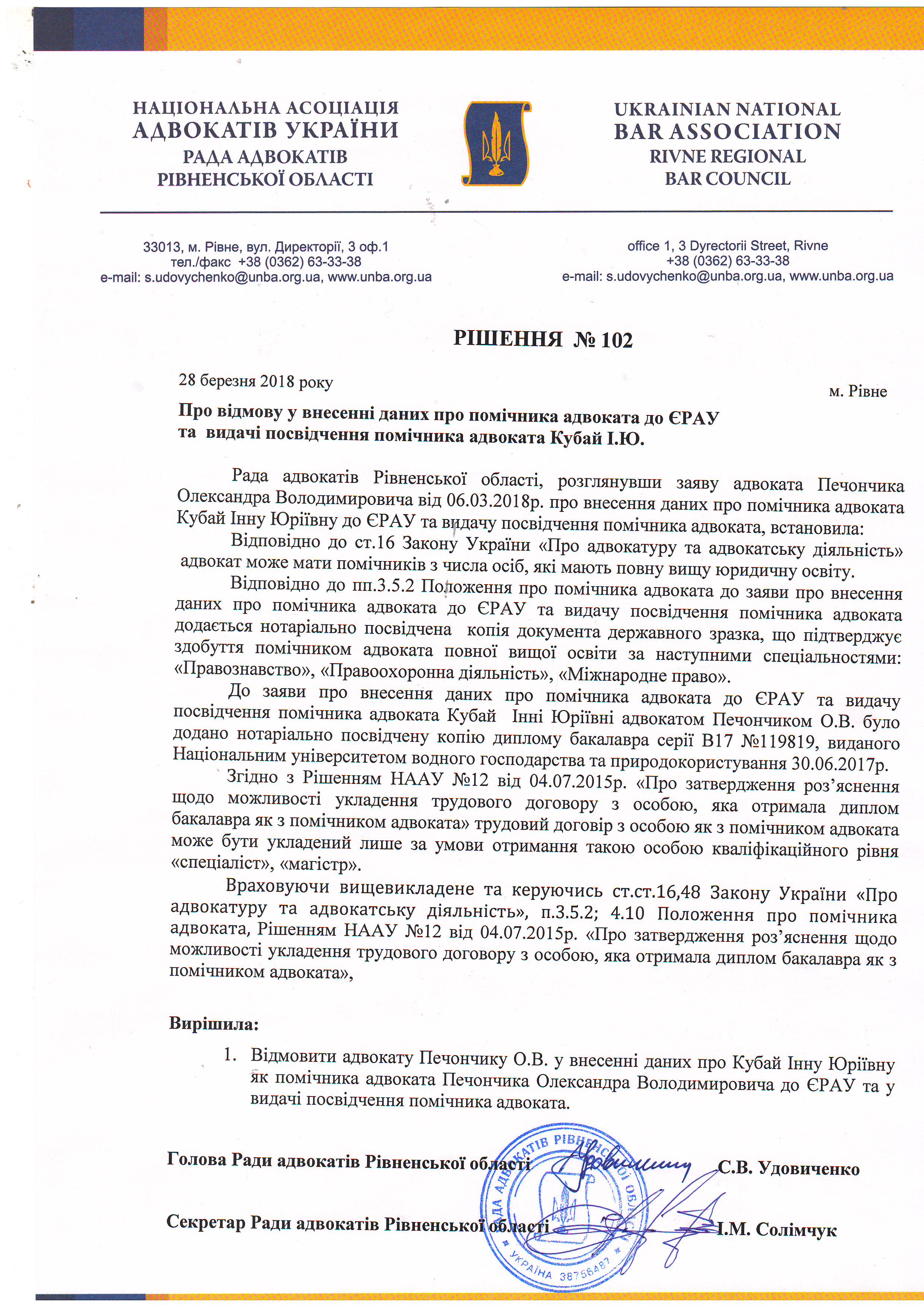 /rishennia/rishennia-rady/836-rishennia-102-pro-vidmovu-u-vnesenni-danykh-pro-pomichnyka-advokata-do-yerau-ta-vydachu-posvidchennia-pomichnyka-advokata-kubai-iyu-vid-28032018-r