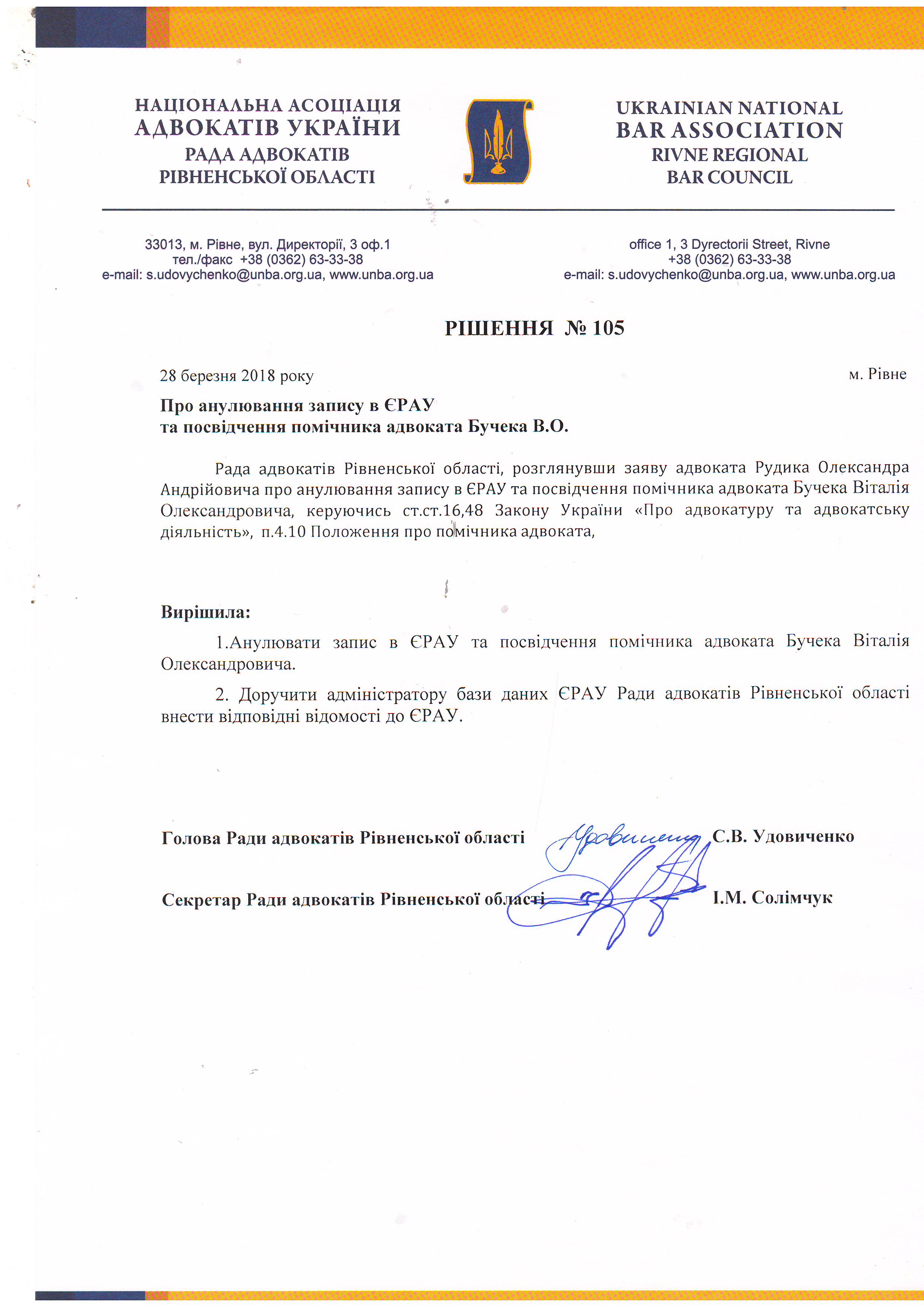 /rishennia/rishennia-rady/839-rishennia-105-pro-anuliuvannia-zapysu-v-yerau-ta-posvidchennia-pomichnyka-advokata-bucheka-vo-vid-28032018-r