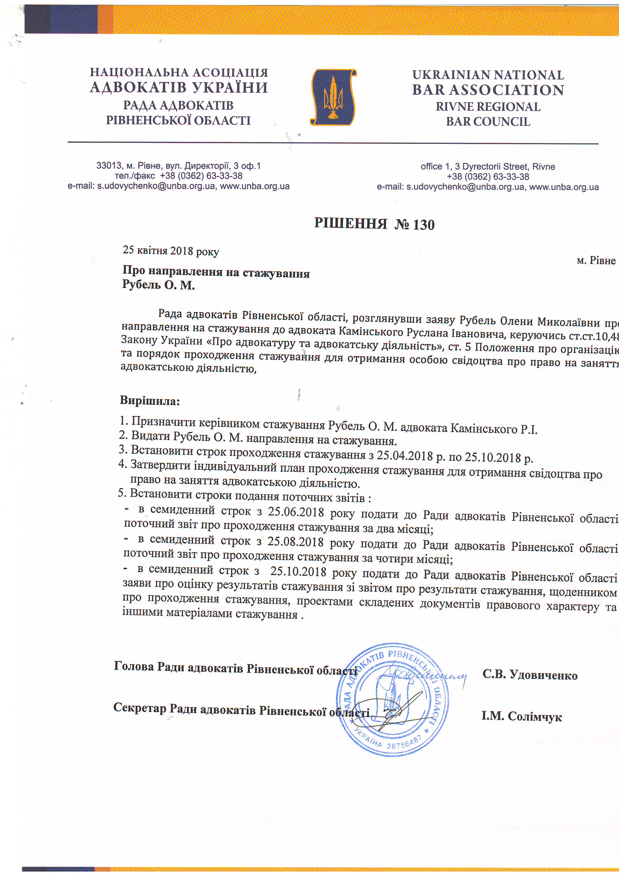 Рішення 130: Про направлення на стажування Рубель О.М. від 25.04.2018 р.