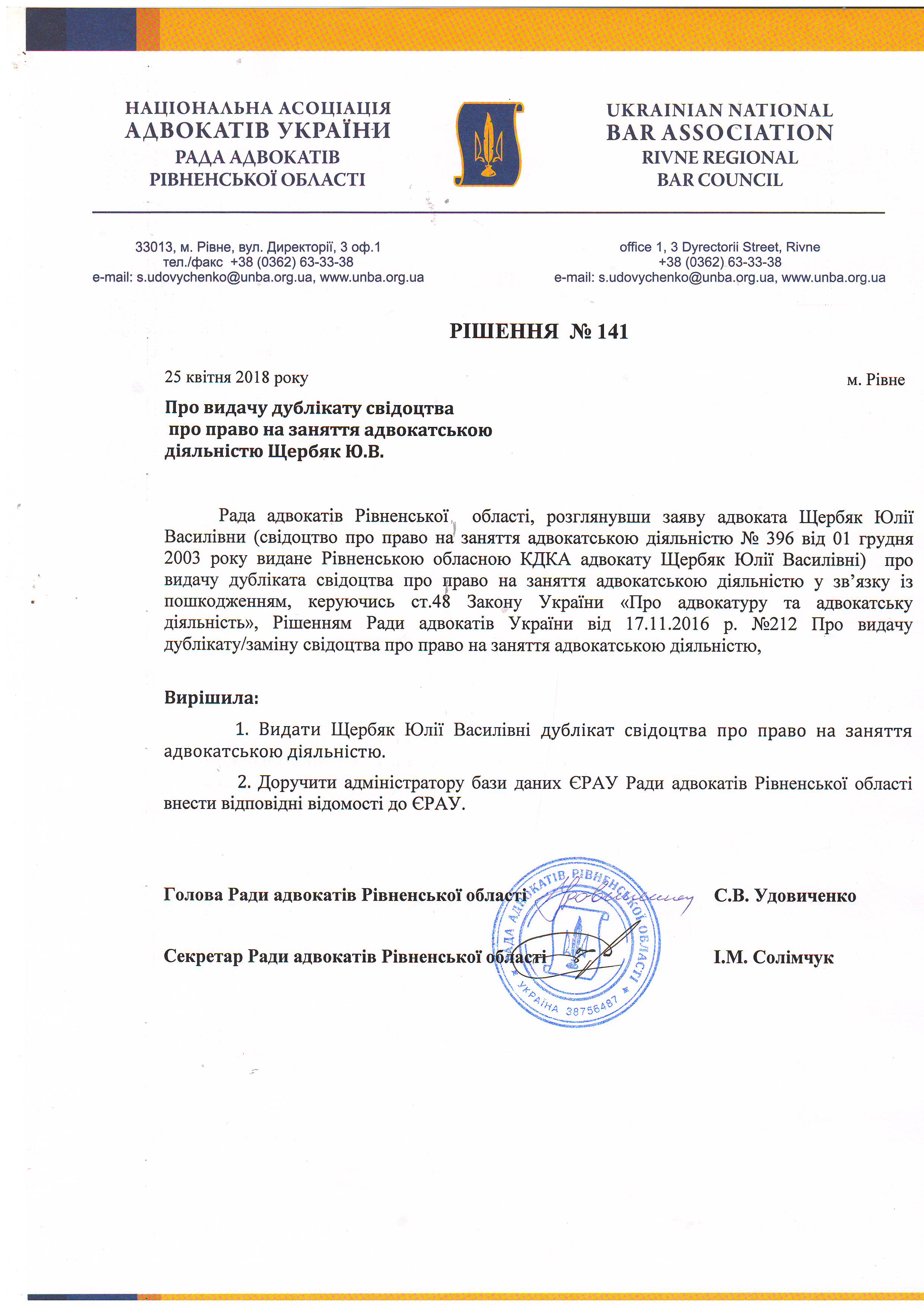/rishennia/rishennia-rady/878-rishennia-141-pro-vydachu-dublikata-svidotstva-pro-pravo-na-zaniattia-advokatskoiu-diialnistiu-shcherbiak-yuv-vid-25042018-r