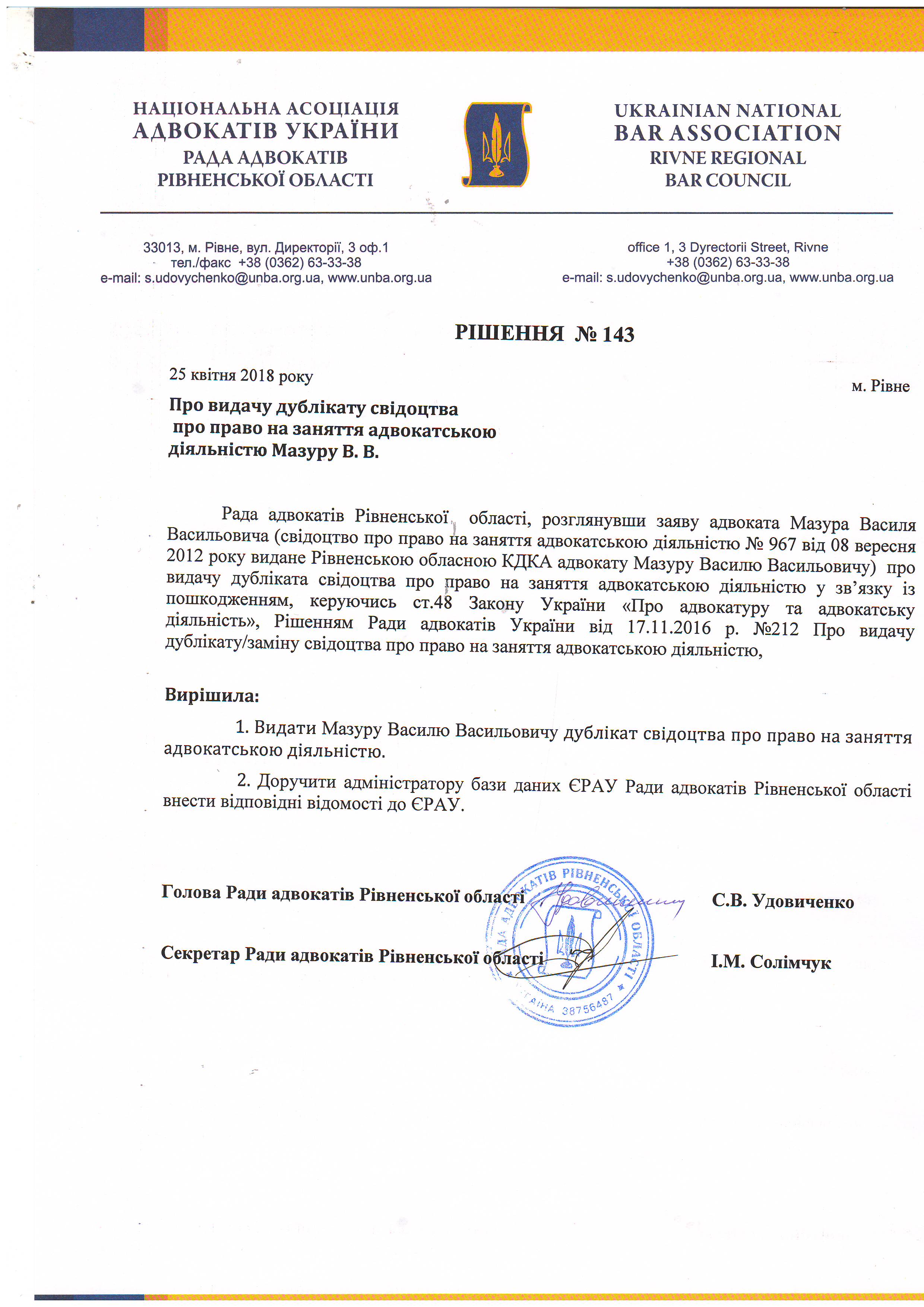 /rishennia/rishennia-rady/880-rishennia-143-pro-vydachu-dublikata-svidotstva-pro-pravo-na-zaniattia-advokatskoiu-diialnistiu-mazuru-vv-vid-25042018-r