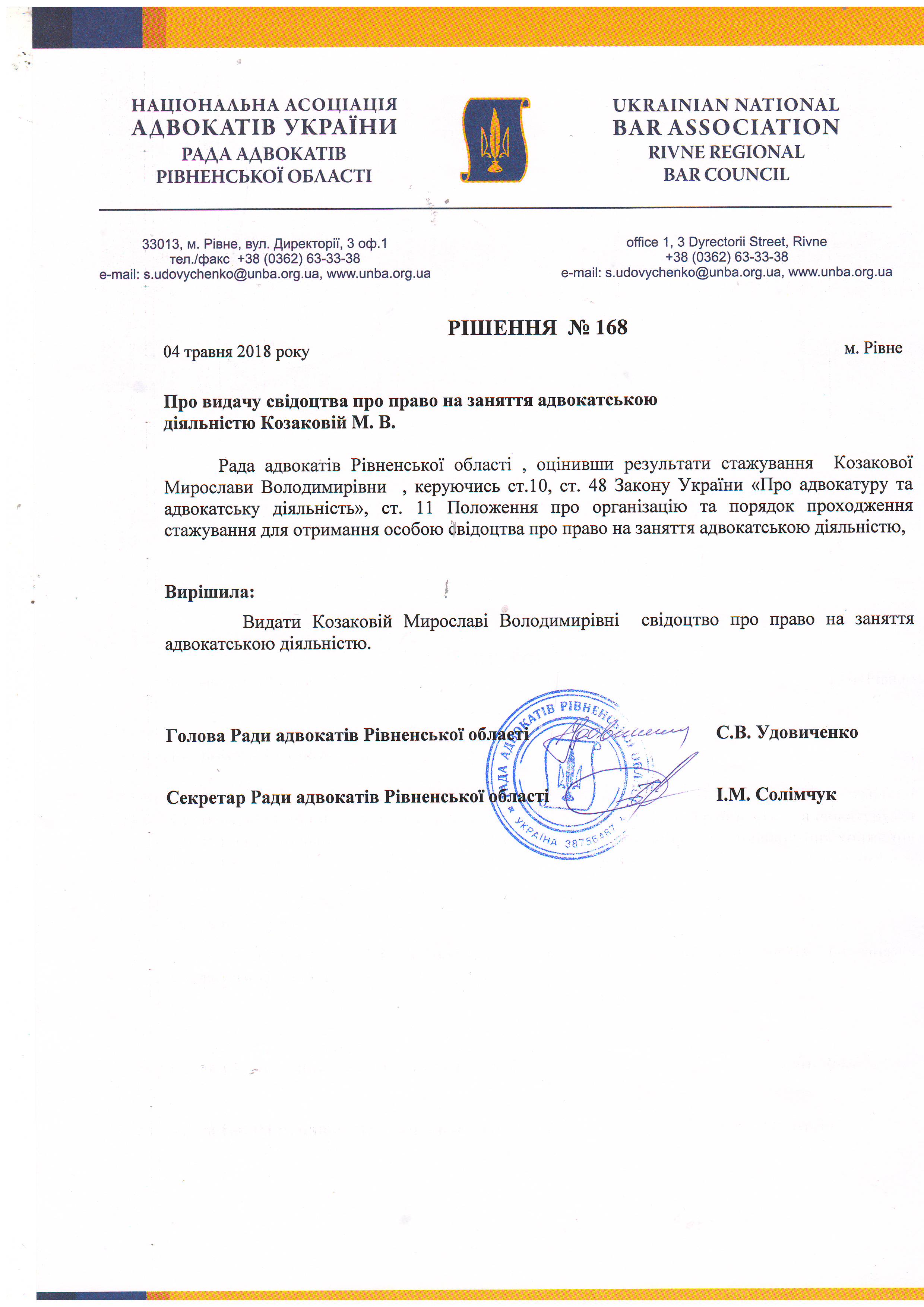 /rishennia/rishennia-rady/905-rishennia-168-pro-vydachu-svidotstva-pro-pravo-na-zaniattia-advokatskoiu-diialnistiu-kozakovii-mv-vid-04052018-r